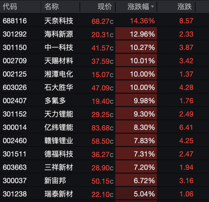 赣锋锂业涨7.83%,现报58.5元/股。天赐材料、湘潭电化、石大胜华、多氟多10cm涨停。天奈科技涨14.36%,海科新源涨12.96%,中一科技涨10.27%。