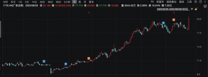 9月29日,港股中资券商股全线大涨。截至收盘,广发证券涨12.5%,华泰证券涨12.55%,中信证券涨11.79%。