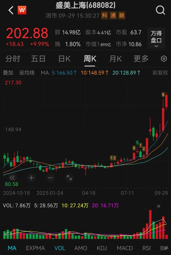 二级市场上,截至9月29日收盘,盛美上海大涨9.99%,报202.88元/股,最新市值为895亿元,今年来股价涨幅翻倍。