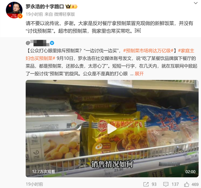另外,近期罗永浩继续在微博上重申,“并没有‘讨伐预制菜’”。他表示,大家是反对餐厅拿预制菜冒充现做的新鲜饭菜,“超市的预制菜,我家里也常买常吃。”