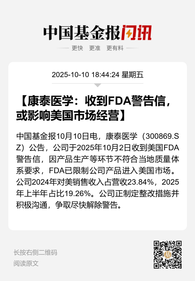 康泰医学10月10日盘后公告称,公司于2025年10月2日收到美国食品药品监督管理局(以下简称FDA)出具的警告信。