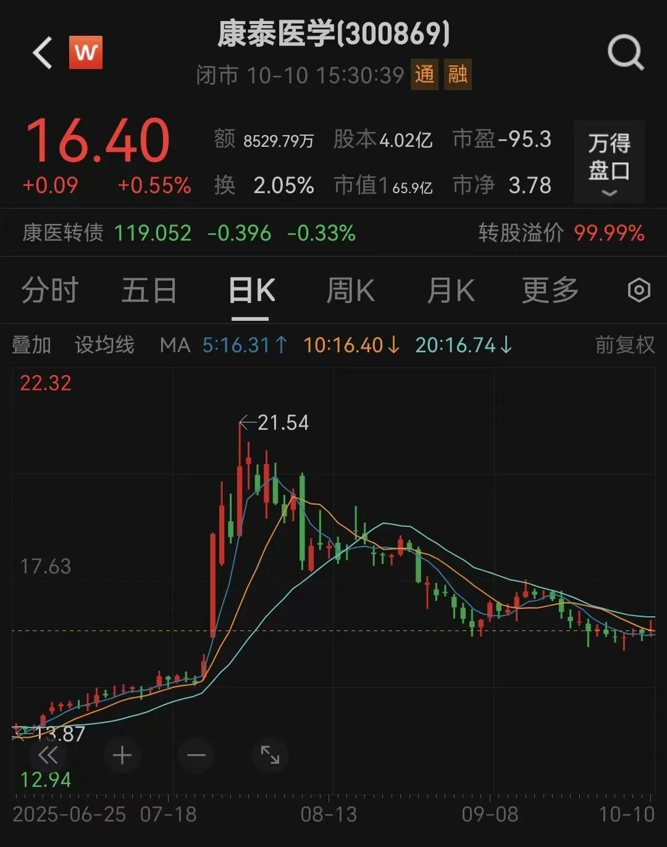 10月10日,康泰医学股价以16.4元/股报收,最新市值为65.9亿元。