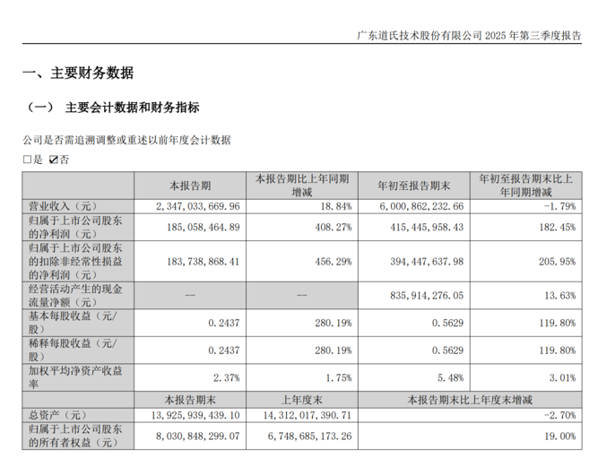 紧随其后,道氏技术(证券代码:300409)也在10月10日晚间发布了2025年三季度报告。
