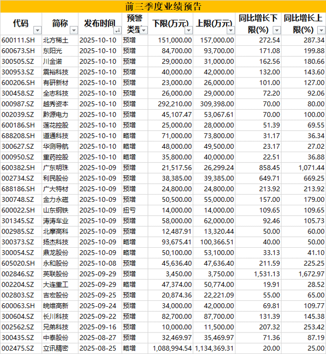 仅10月10日晚间,就有北方稀土、东阳光、川金诺等12家公司发布了前三季度业绩预告。其中,北方稀土预计归属于上市公司股东的净利润为15.1亿~15.7亿元,同比增长272.54%~287.34%。