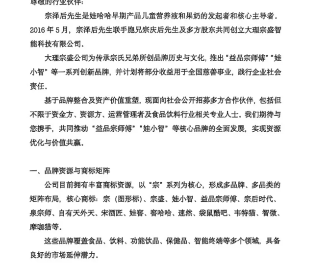 根据“宗盛商业”微信公众号9月17日推文,2016年5月,宗泽后携手宗庆后及多方股东共同创立大理宗盛智能科技有限公司。公司现拥有丰富商标资源,以“宗”系列为核心,形成多品类、多品牌的矩阵布局,核心商标:宗(图形标)、宗盛、娃小智、益品宗师傅、宗后时代、泉宗师等,品牌覆盖食品、饮料、功能饮品、保健品、智能终端等多个领域。