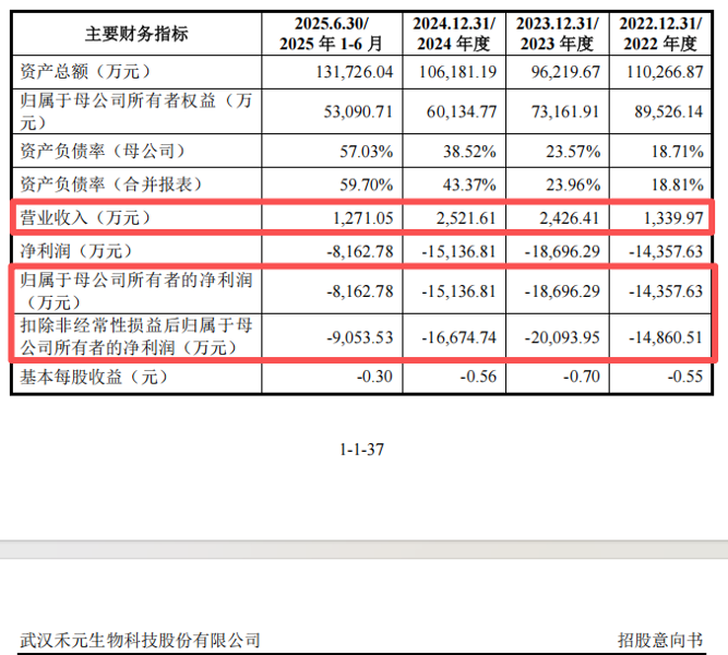 2022年至2024年及2025年上半年,禾元生物的营业收入分别为1339.97万元、2426.41万元、2521.61万元及1271.05万元,归母净利润分别为-1.44亿元、-1.87亿元、-1.51亿元及-8162.78万元。