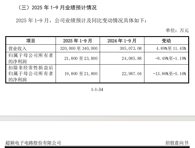 超颖电子预计,公司2025年前三季度的营业收入为32亿元至34亿元,同比变动比例为4.89%至11.45%;归母净利润为2.18亿元至2.38亿元,同比变动比例为-9.49%至-1.19%。