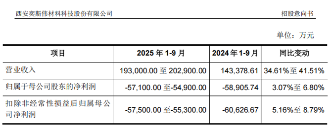 西安奕材预计,公司2025年前三季度的营业收入为19.30亿元至20.29亿元,同比变动比例为34.61%至41.51%;归母净利润为-5.71亿元至-5.49亿元,同比变动比例为3.07%至6.80%。