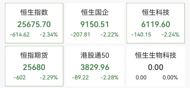 港股同样低开,三大指数均跌逾2%,哔哩哔哩、联想集团、比亚迪电子、小鹏汽车、蔚来均跌超4%。