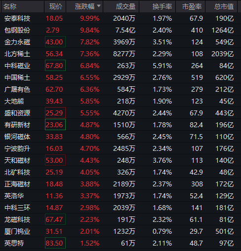 早盘稀土永磁板块强势走高,安泰科技、包钢股份涨停,金力永磁、北方稀土、中科磁业涨幅靠前。