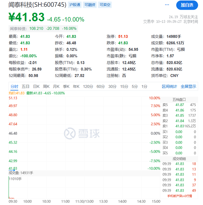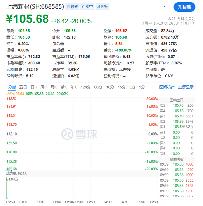 “大牛股”上纬新材复牌20%跌停,股价报105.68元/股。