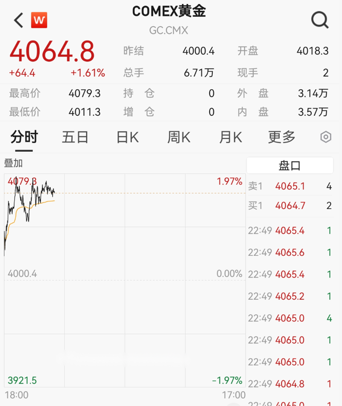 COMEX黄金同步走高,盘中最高触及4079.3美元/盎司,最高涨幅达1.97%。