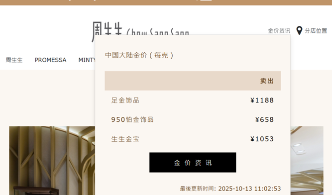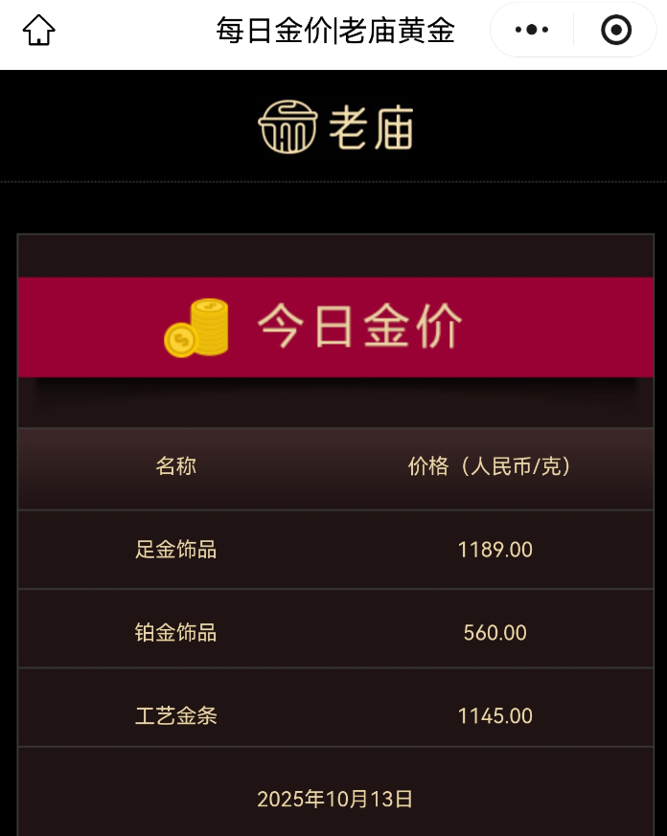 老庙黄金品牌金饰为1189元/克,较上日涨6元/克;周生生报1188元/克,较上日大涨12元/克;老凤祥报1182元/克,较上日涨10元/克。