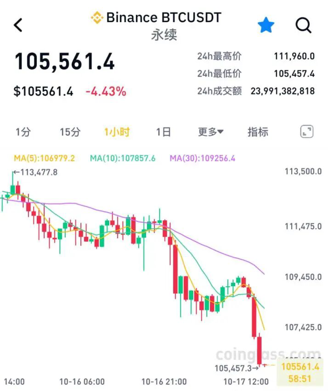 10月17日下午,加密货币市场集体暴跌,比特币失守10.6万美元关口,最新报105561.4美元/枚。