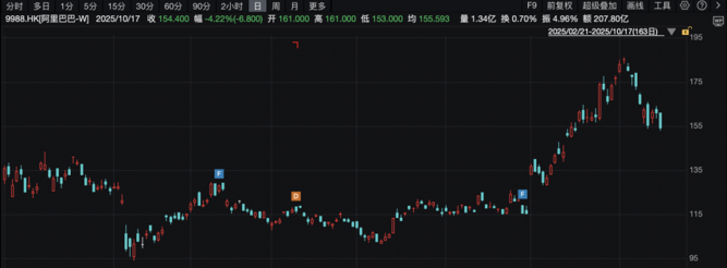 10月17日,阿里巴巴-W收跌4.22%,报154.4港元/股,成交额为207.8亿港元。