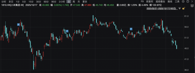 10月17日,小米集团-W收跌3.65%,报45.96港元/股,成交额为122.97亿港元。