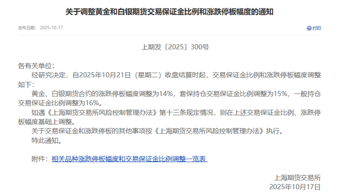 10月17日,上海期货交易所(以下简称上期所)发布关于调整黄金和白银期货交易保证金比例和涨跌停板幅度的通知。经研究决定,自2025年10月21日(星期二)收盘结算时起,调整交易保证金比例和涨跌停板幅度。