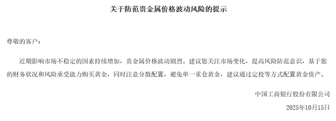 10月15日,工商银行发布关于防范贵金属价格波动风险的提示,建议投资者关注市场变化,增强风险防范意识,基于财务状况和风险承受能力购买黄金,同时注意分散配置,避免单一重仓黄金,建议通过定投等方式配置黄金资产。