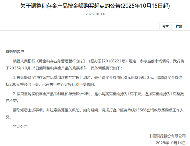 此外,中国银行宣布,自10月15日起,按金额购买积存金产品或创建积存定投计划时,最小购买金额由850元调整为950元,追加购买金额维持200元整数倍不变。