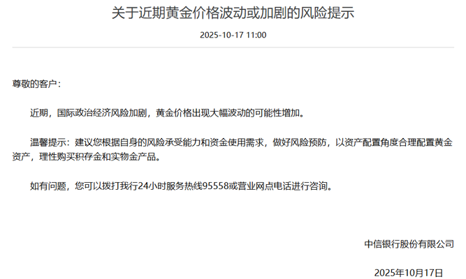 10月17日,中信银行官网公告称,近期,国际政治经济风险加剧,黄金价格出现大幅波动的可能性增加。该行提示,建议客户根据自身的风险承受能力和资金使用需求,做好风险预防,以资产配置角度合理配置黄金资产,理性购买积存金和实物金产品。