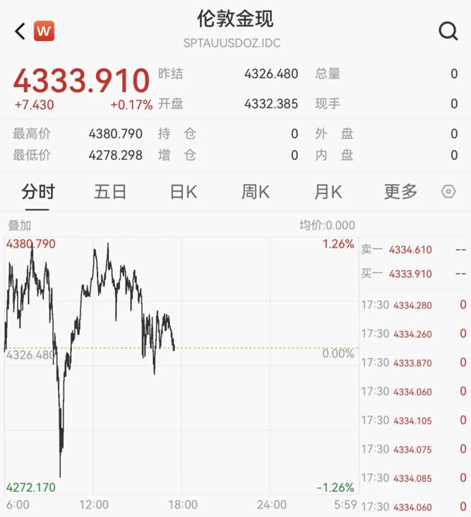 近期,黄金价格波动加大。10月17日,现货黄金价格一度下探,随后震荡拉升,现报4333.91美元/盎司。