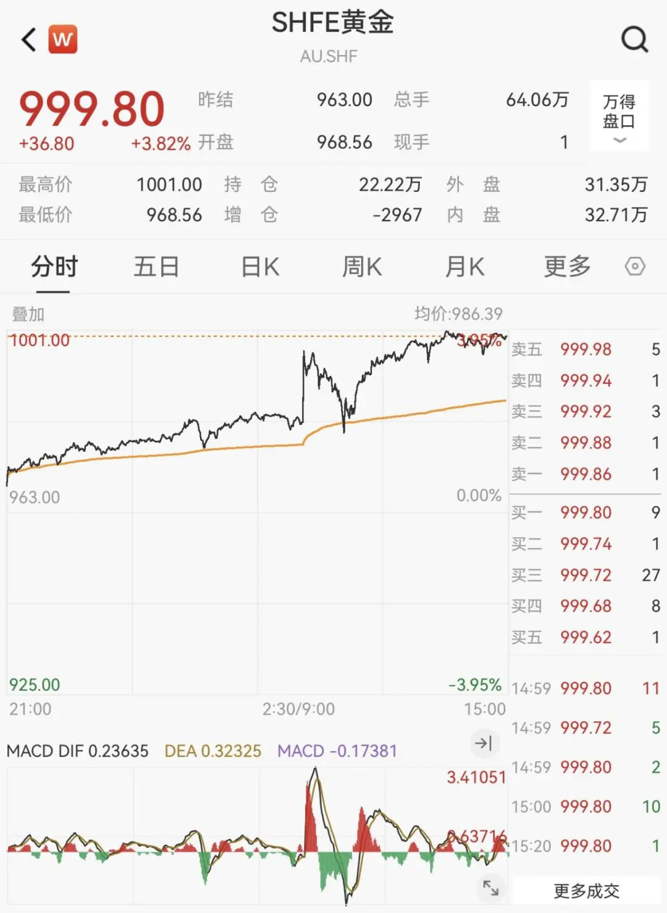沪金主力合约一度站上1000点整数关口,再创历史新高。