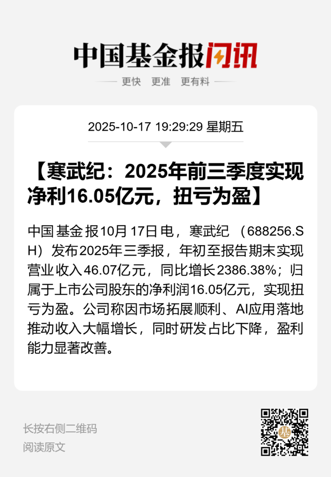 【导读】寒武纪前三季度实现营收46.07亿元,同比增长2386.38%