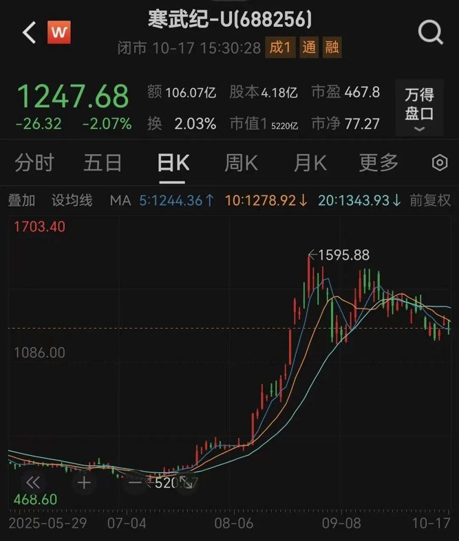10月17日,寒武纪股价以1247.68元/股收盘,最新市值为5220亿元。