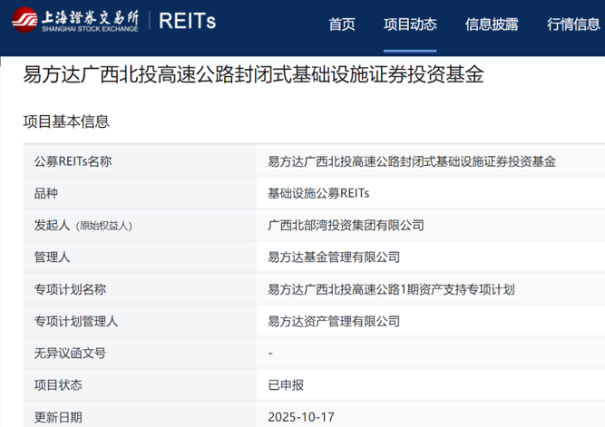 10月17日晚间,上交所网站信息显示,易方达广西北投高速公路REIT正式申报。据悉,这是广西首单公募REITs项目。