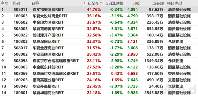 拉长时间来看,下半年,REITs市场表现不佳。尽管中证REITs全收益指数在8月下旬一度企稳,但9月以来指数持续阴跌,使得一部分收益“回吐”。截至10月16日,中证REITs全收益指数年涨幅为8.26%。整体来看,有超九成REITs产品年内累计涨幅为正,有14只年内涨幅超过20%。其中,嘉实物美消费REIT年内涨幅超44%,紧随其后的是华夏大悦城商业REIT年内涨幅超36%,中金印力消费REIT、华夏首创奥莱REIT、博时津开产园REIT等多只产品年内涨幅超30%。