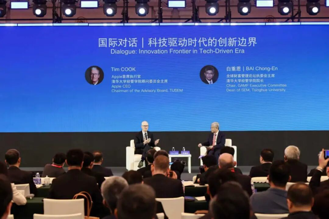 10月18日,苹果公司首席执行官库克出席在上海举行的全球财富管理论坛·2025上海苏河湾大会,与全球财富管理论坛执委会主席、清华大学经管学院院长白重恩围绕“科技驱动时代的创新边界”进行对话。