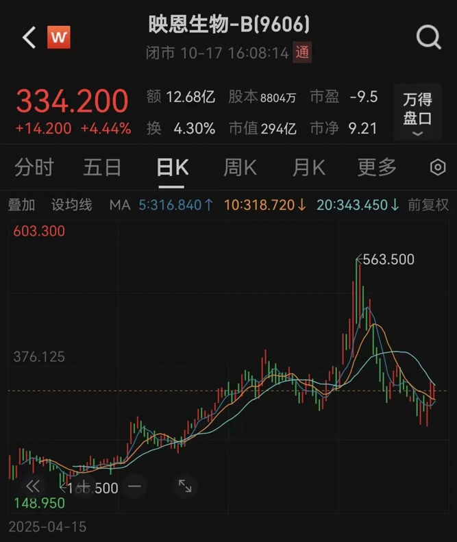 10月17日,映恩生物股价以334.2港元/股收盘,最新市值为294亿港元。