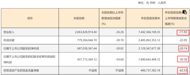 2025年第三季度,片仔癀营业收入、净利润和扣非净利润分别为20.64亿元、6.87亿元和4.38亿元,同比分别下滑26.28%、28.82%和54.6%。受第三季度下滑幅度加大的拖累,今年前三季度片仔癀的营收、净利润和扣非后的净利润分别为74.72亿元、21.29亿元和18.91亿元,同比分别下滑11.93%、20.74%和30.38%。前三季度,公司经营活动产生的现金流量净额则下滑了62.53%。