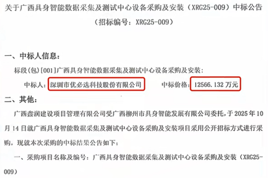 10月19日,记者从“人形机器人第一股”优必选方面获悉,公司于10月16日中标“广西具身智能数据采集及测试中心设备采购及安装”项目,订单金额达1.26亿元。