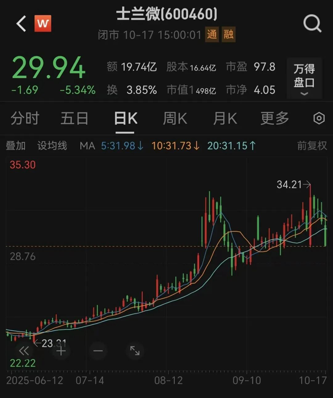 10月17日,士兰微股价以29.94元/股收盘,当日大跌5.34%,最新市值为498亿元。