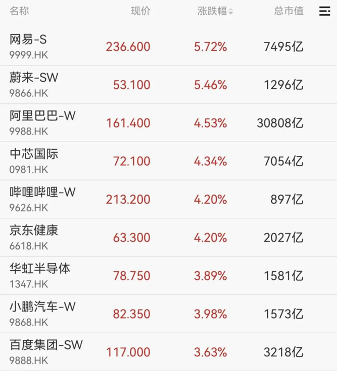 港股方面,三大指数纷纷走高,恒生科技指数涨超3%,网易、蔚来、阿里巴巴等涨超4%。