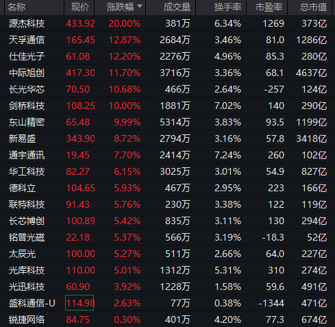 CPO概念股震荡拉升,源杰科技20%涨停,天孚通信、中际旭创涨幅居前,剑桥科技、东山精密涨停。