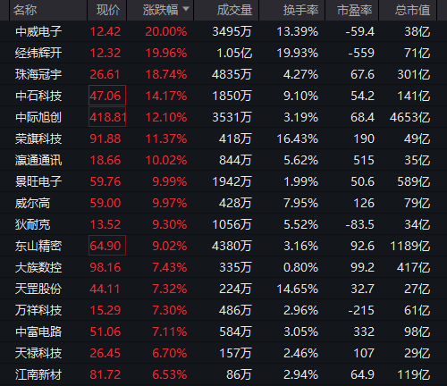 通信设备、电子元器件板块走强,中威电子、经纬辉开20%涨停,珠海冠宇、中石科技、荣旗科技等跟涨。