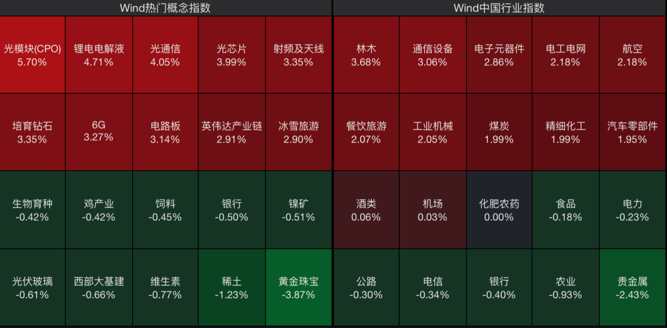 从板块看,大多数板块飘红,光模块(CPO)、锂电电解液、光通信、光芯片概念板块涨幅居前,通信设备、电子元器件、林木、餐饮旅游、煤炭板块上涨;贵金属板块领跌,稀土、银行等板块回调。