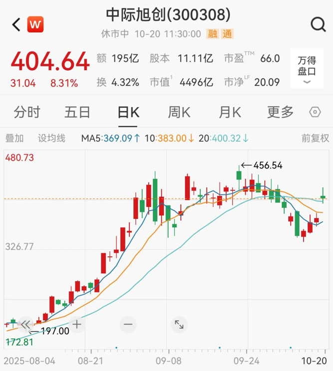 “易中天”大涨。中际旭创涨8.31%,现报404.64元/股,最新市值达4496亿元。