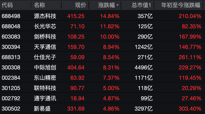 剑桥科技涨停,源杰科技涨14.84%,长光华芯涨近12%,仕佳光子、东山精密涨超7%,通宇通讯、联特科技、铭普光磁等纷纷上涨。