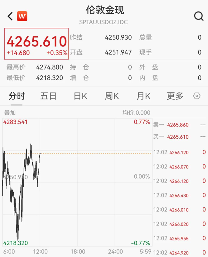 国际金价持续震荡。截至发稿,现货黄金报4265.61美元/盎司,日内涨0.35%。