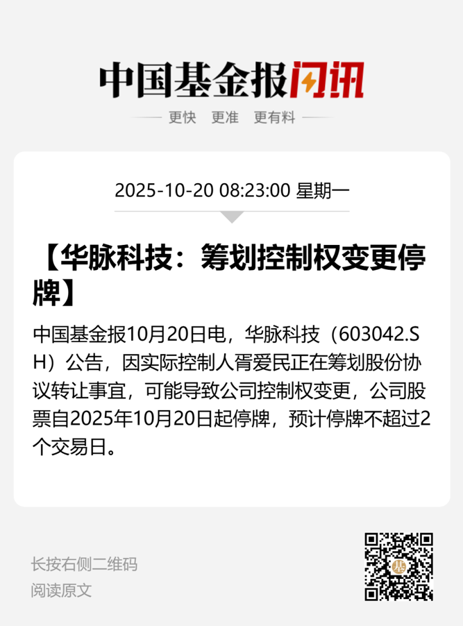 10月20日盘前,华脉科技(证券代码:603042)发布公告称,公司实际控制人胥爱民正在筹划公司股份协议转让事宜,该事项可能导致公司控制权发生变更。经向上交所申请,公司股票于10月20日(星期一)开市起停牌,预计停牌时间不超过2个交易日。