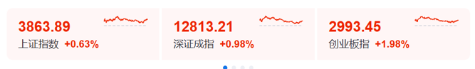 10月20日,沪指全天红盘震荡,创业板指冲高回落。截至收盘,沪指涨0.63%,深成指涨0.98%,创业板指涨1.98%。