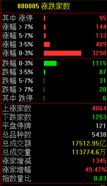 全市场共4064只个股上涨,95只个股涨停,1253只个股下跌。