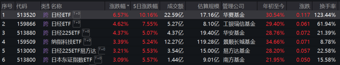 截至收盘,华夏日经ETF以6.57%的涨幅领涨,工银瑞信日经ETF、华安日经225ETF双双涨超4%。此外,易方达基金和南方基金旗下挂钩日股的ETF涨超3%。