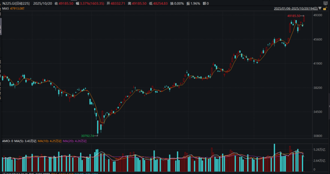 日本股市今日大涨,日经225指数盘中首次突破49000点,截至收盘上涨3.4%,创下49185.50点的历史新高。