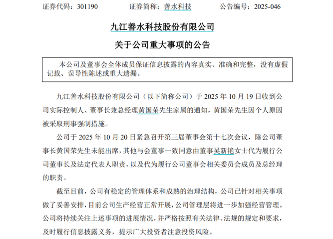 10月20日,善水科技发布公告称,公司实控人、董事长兼总经理黄国荣因个人原因被采取刑事强制措施。