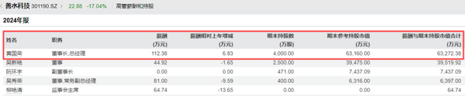 2024年年报显示,黄国荣年薪为112.38万元。截至2025年二季度末,黄国荣持股数量为4000万股,持股比例为18.64%,为善水科技第一大股东。