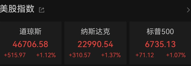 截至收盘,道指涨515.97点,涨幅为1.12%;纳指涨310.57点,涨幅为1.37%;标普500指数涨71.12点,涨幅为1.07%。